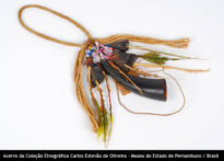 Apito Voltar Miniatura Compartilhar PovoApinajeDescriçãoApito cerimonial, de chifre de animal, medindo 24 cm. Alça de fios de algodão trançado, com pingentes de miçangas, unha de veado e penas de papagaio (deterioradas).Identificador63CategoriaDiversosMateriaisChifre de animal | Fios de algodão | Miçangas | Penas de papagaio | Unha de veado Continue navegando Apito Bastão Cerimonial Voltar para a página de itens