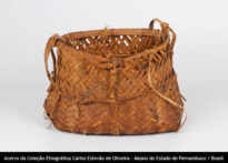 Cesto Voltar Miniatura Compartilhar PovoApinajeDescriçãoCesto bolsiforme, de inajá, medindo 17 x 23 cm. Trançado em sarja, iniciado pelo fundo com fios de buriti em volta da peça. Duas alças trançadas.Identificador16CategoriaTrançadoMateriaisFios de buriti (Mauritia flexuosa L.f.) | Palha de inajá (Maximiliana maripa (Correa da Serra) Drude) Continue navegando Cesto Cinto Voltar para a página de itens