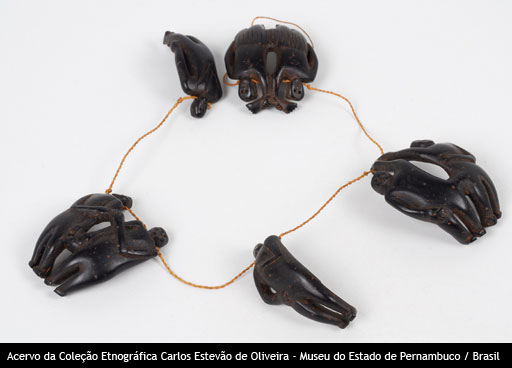 Colar Voltar Miniatura Compartilhar PovoTukunaDescriçãoColar de figuras zoomorfas e antropomorfas, feitas de caroço, medindo 32 cm.Identificador61CategoriaDiversosMateriaisCaroço de tucumã (Astrocaryum tucuma Mart.) | Fios de tucum (Astrocaryum sp.) Continue navegando Colar Colar Voltar para a página de itens