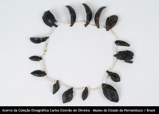 Colar Voltar Miniatura Compartilhar PovoTukunaDescriçãoColar de miçangas intercaladas com figuras zoomorfas, feitas de caroço, medindo 21 cm.Identificador79CategoriaDiversosMateriaisCaroço de tucumã (Astrocaryum tucuma Mart.) | Miçangas Continue navegando Colar Colar Voltar para a página de itens
