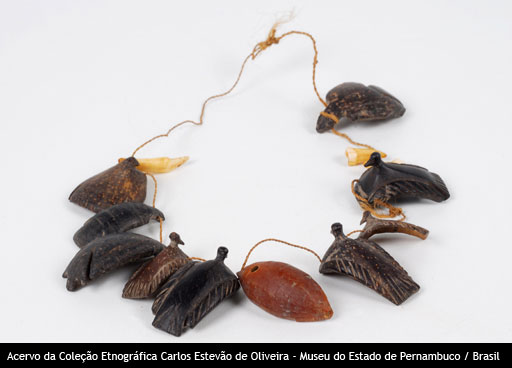 Colar Voltar Miniatura Compartilhar PovoTukunaDescriçãoColar de figuras zoomorfas feitas de caroço e dentes, medindo 16 cm (reconstituído).Identificador90CategoriaDiversosMateriaisCaroço de tucumã (Astrocaryum tucuma Mart.) | Dentes Continue navegando Colar Colar Voltar para a página de itens