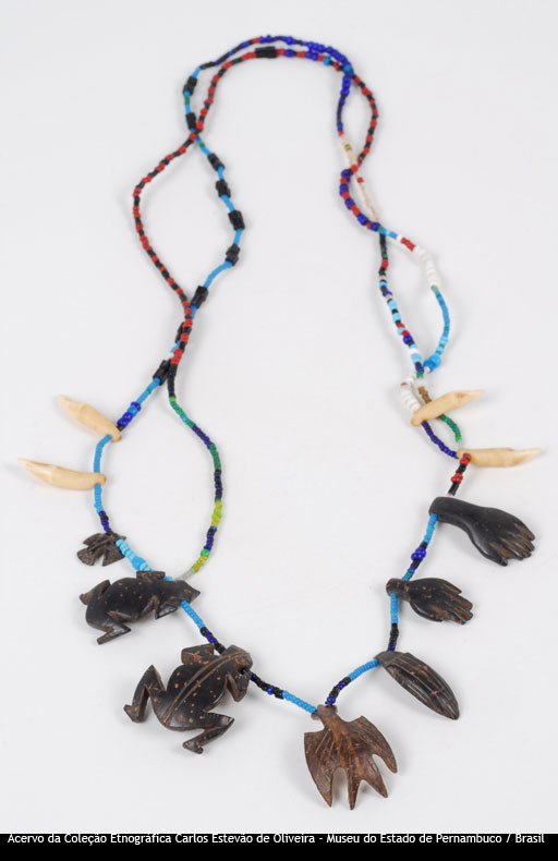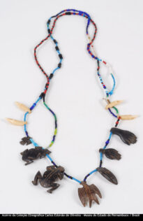 Colar Voltar Miniatura Compartilhar PovoTukunaDescriçãoColar de duas voltas, de miçangas intercaladas com dentes e figuras zoomorfas feitas de caroço, medindo 29 cm.Identificador92CategoriaDiversosMateriaisCaroço de tucumã (Astrocaryum tucuma Mart.) | Dentes | Miçangas Continue navegando Colar Colar Voltar para a página de itens