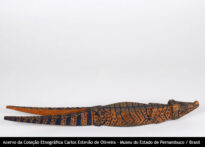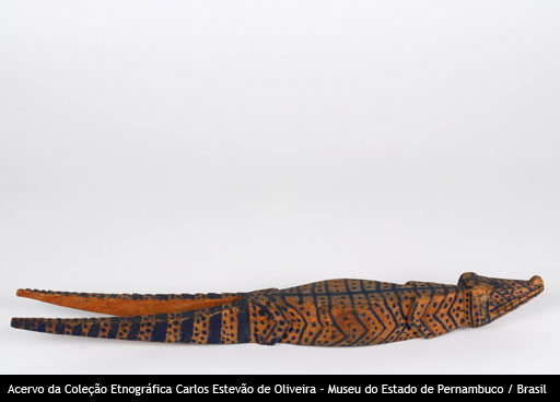 Escultura Voltar Miniatura Compartilhar PovoPalikurDescriçãoEscultura zoomorfa (jacaré, com cauda dupla), de madeira, medindo 43,5 cm, com pintura linear e pontilhada.Identificador145CategoriaObjetos em madeiraMateriaisMadeira Continue navegando Escultura Escultura Voltar para a página de itens