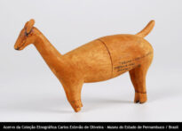 Escultura zoomorfa (veado), em madeira, medindo 18 cm de comprimento.