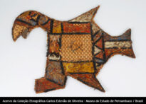 Figura Voltar Miniatura Compartilhar PovoWayanaDescriçãoFigura cerimonial, zoomorfa, de palha, medindo 58 cm de comprimento e 44 cm de altura. Trançado simples, formando um animal, coberto com plumagens vermelhas, amarelas, azuis e pretas.Identificador14CategoriaTrançadoMateriaisPalha de arumã (Ischnosiphon ovatus Kche.) | Plumas Continue navegando Figura Cinto Voltar para a página de itens