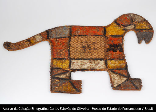 Figura cerimonial, zoomorfa, de palha, medindo 78 cm de comprimento e 52 cm de altura. Trançado simples, formando um animal coberto com plumagens vermelhas, amarelas, azuis e pretas.