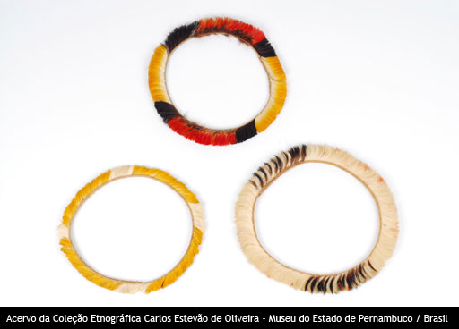 Aro de vareta flexível, com as plumas presas à mesma por fios de algodão, medindo 17,5 cm de diâmetro.