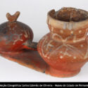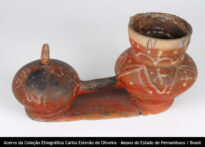 Vaso simétrico (duplo). Um de gargalo, com a boca constrita, contorno infletido e forma ovoidal ponteagudo. Base plana. Borda direta, reforçada interna e vertical. Lábio plano. O outro é um vaso-reservatório, de forma esferoidal, todo fechado, ligado por um tubo no corpo e uma placa na base. Medidas: a) Altura - 16,5 cm; altura do gargalo - 6 cm; largura máxima - 16 cm; diâmetro externo da boca - 12 cm; b) Altura - 13 cm; largura máxima 12,5 cm.